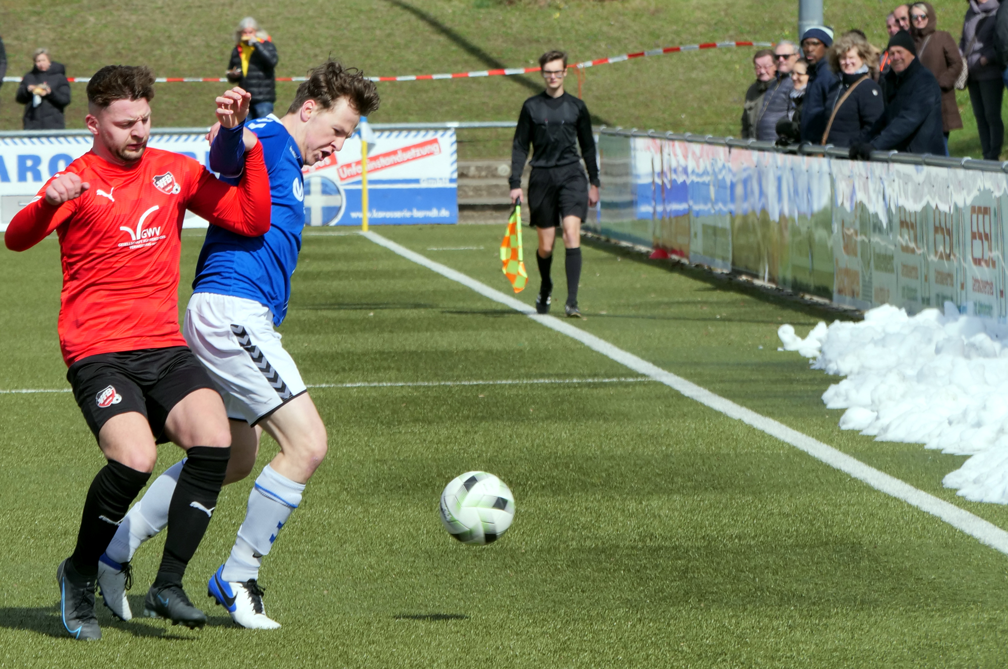 Trotz des bereits deutlichen Abstands zum rettenden Ufer dachten die Gäste nicht daran, sich ihrem Schicksal zu fügen. Im Gegenteil, sie beschäftigten die Pfullinger Defensive mehr, als dieser lieb sein konnte. Ein erstes Mal musste VfL-Schlussmann Martin Welsch nach 17 Minuten eingreifen, als er einen Schuss von Mardoche Calemba entschärfte. Die Hausherren kamen nur langsam in die Partie, was auch daran lag, dass die Bälle in die Spitze selten ankamen. Mit Ausnahme in der 26. Minute. Lukas Glaser passte von links in die Mitte, dort war Kapitän Matthias Dünkel zur Stelle und beförderte den Ball etwas unkonventionell zum 1:0 über die Linie. Dies schockte den VfB wenig, der weiter sein Heil in der Offensive suchte. So hielt Welsch die Führung nach einem Kopfball von Spielertrainer Sebastian Rief und einen Schussversuch von Emmanuel MC Donald fest. Auch das zweite Tor fiel auf der anderen Seite. Sven Packert, dessen Einsatz wegen Knieproblemen auf der Kippe stand, wagte sich in den Strafraum orientierte sich zur die Mitte und zog ab. Sein Schuss prallte von der Latte zurück und kam zu Roman Schubmann, der mit seinem Versuch den Pfosten traf. Erneut fiel der Ball Packert vor die Füße, der schlussendlich zum 2:0 abschließen konnte (44.)
